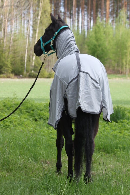 Harmaa hyönteisloimi kiinteällä korkealla kaulaosalla on valmistettu vahvasta verkkomateriaalista ja siinä on lisäksi UV-suoja. Mallissa on korkeat lapalaskokset, jonka ansiosta loimi asettuu hyvin paikoilleen isoillakin hevosilla, suojaava korkea kaulaosa tarrakiinnityksellä, vatsa- ja häntäläpät, joustavat jalkalenkit ja reilu säätövara edessä.